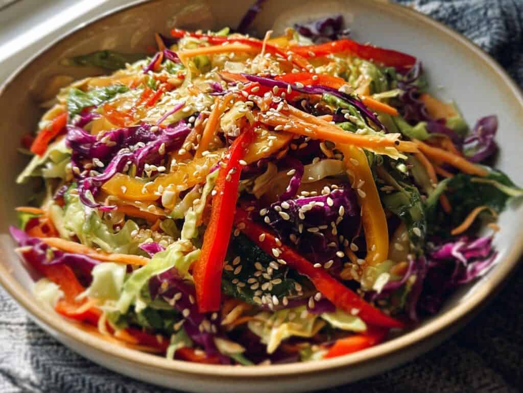 A crisp and flavorful Asian Sesame Cabbage Salad, featuring shredded cabbage, carrots, bell peppers, and green onions tossed in a balanced sesame-ginger dressing. It’s a refreshing, customizable, and healthy salad perfect for any occasion.