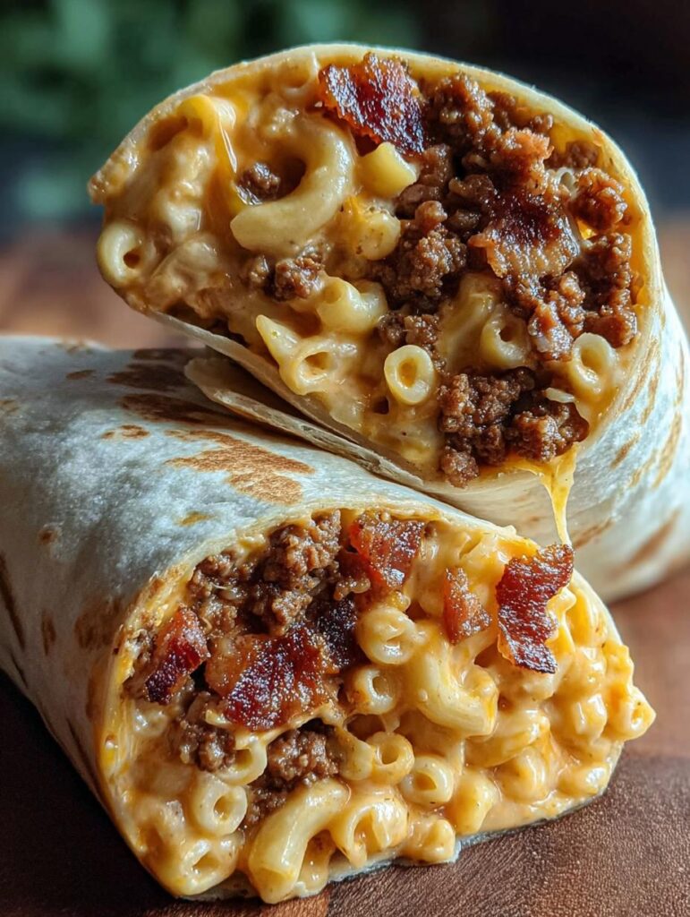 This hearty wrap combines juicy beef, crispy bacon, creamy macaroni, and melted cheddar cheese in a soft tortilla for a satisfying meal. It merges the comforting flavors of a cheeseburger and mac & cheese into one convenient, handheld dish.