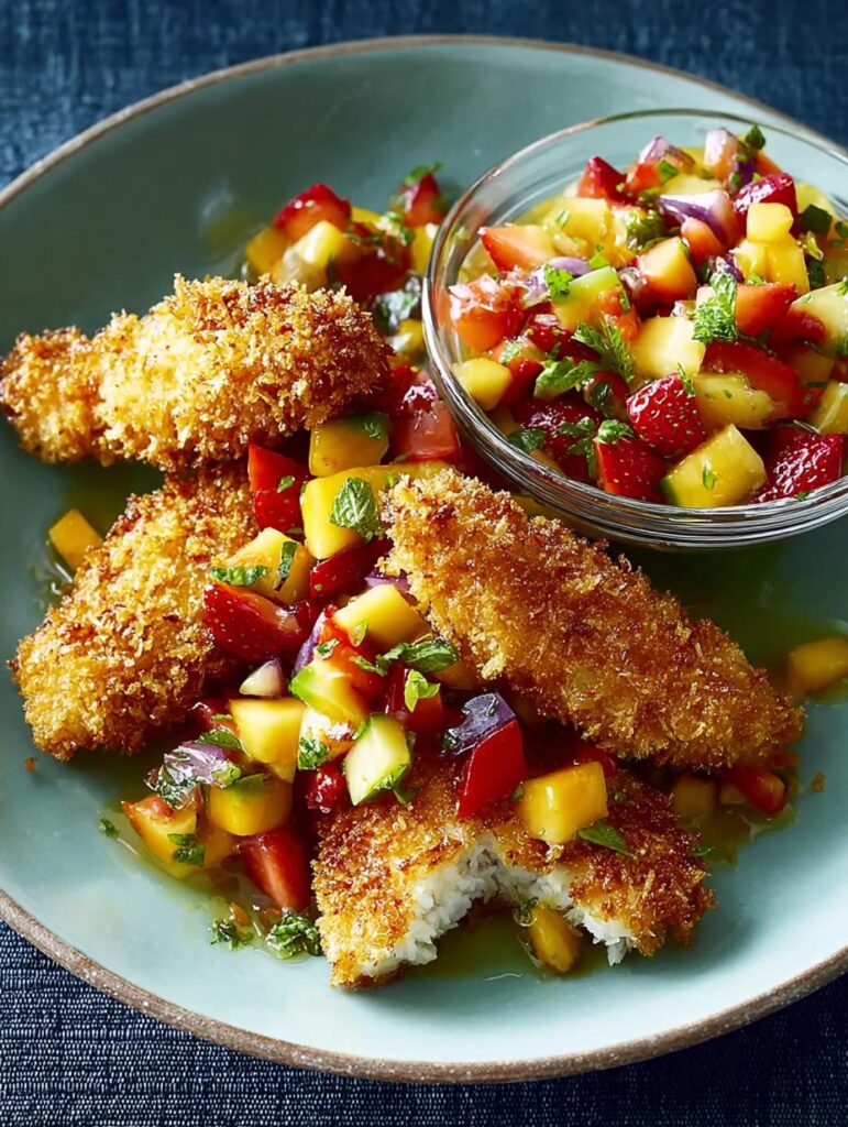 - Step 8: Serve your crispy coconut tenders alongside the strawberry-mango salsa.