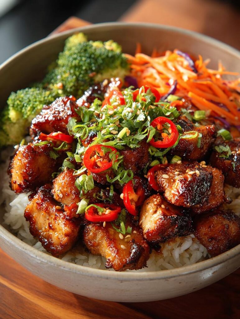 A satisfying bowl with chicken, veggies, rice, and bold creamy-spicy flavors.