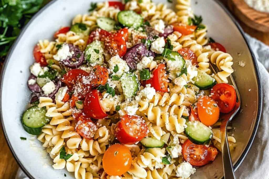 Greek Pasta Salad: Focus on cucumber, tomato, red onion, and extra feta with a heavy oregano presence in the dressing.