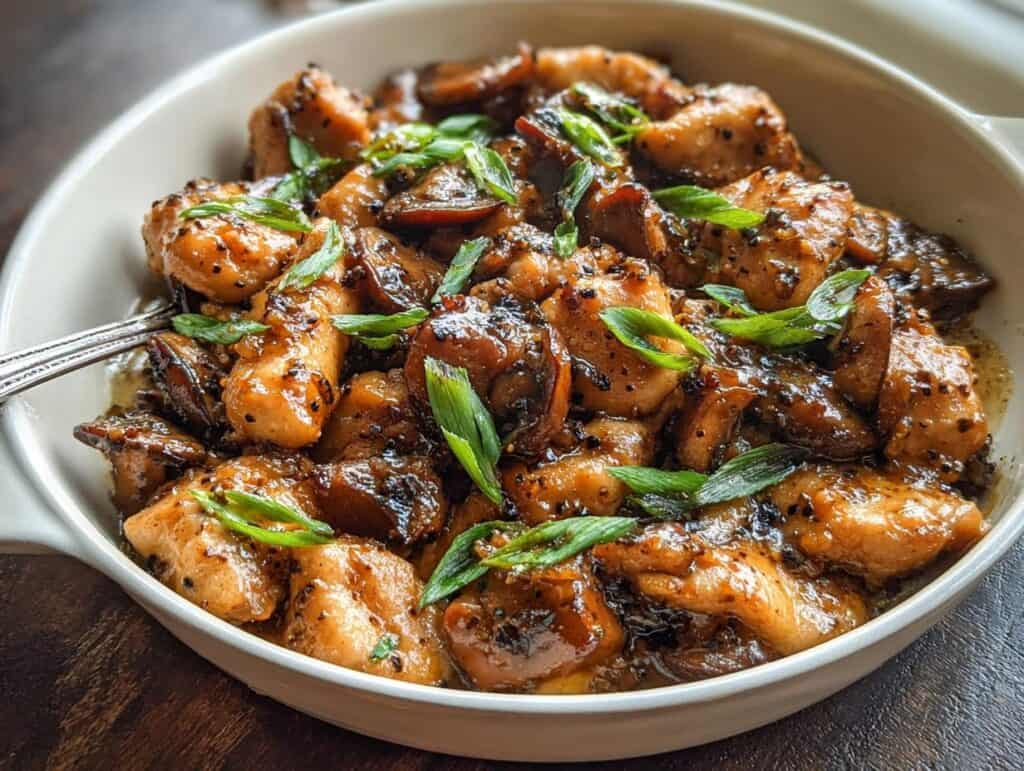 This Black Pepper Chicken with Mushrooms is a bold, peppery dish that’s full of savory flavors and minimal effort. Succulent chicken pieces are stir-fried with hearty mushrooms, coated in a sticky, fragrant black pepper sauce, and finished with a glossy, flavorful glaze.