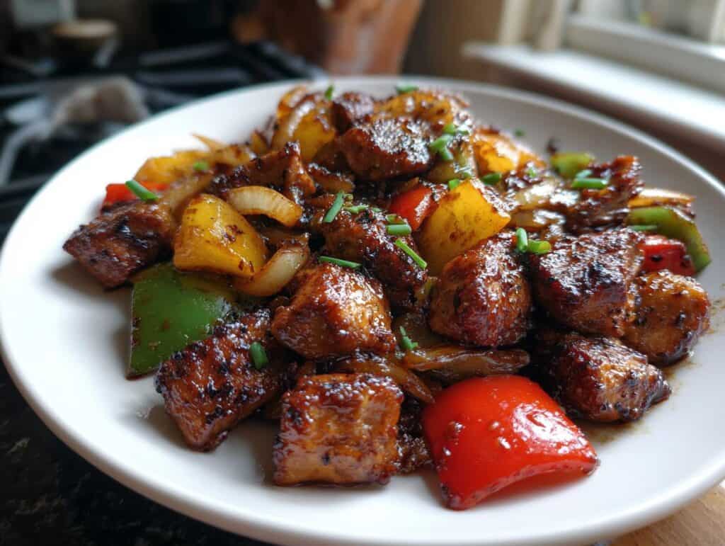 Blackstone Bourbon Chicken is a flavorful dish made on a griddle, featuring tender chicken and sautéed vegetables in a rich bourbon marinade.