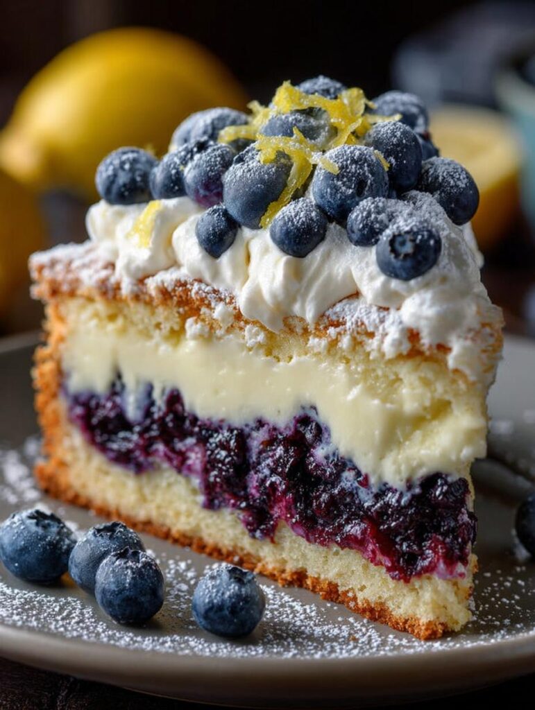 Moist cake bursting with blueberries and lemon zest, topped with a light whipped lemon creme for a refreshing dessert.
