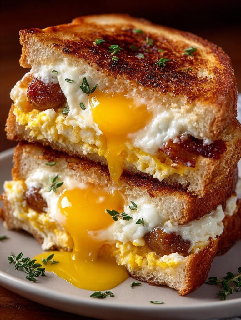 Savory sandwich with sourdough, cheese, eggs, and sausage. Quick, hearty, and full of flavor.