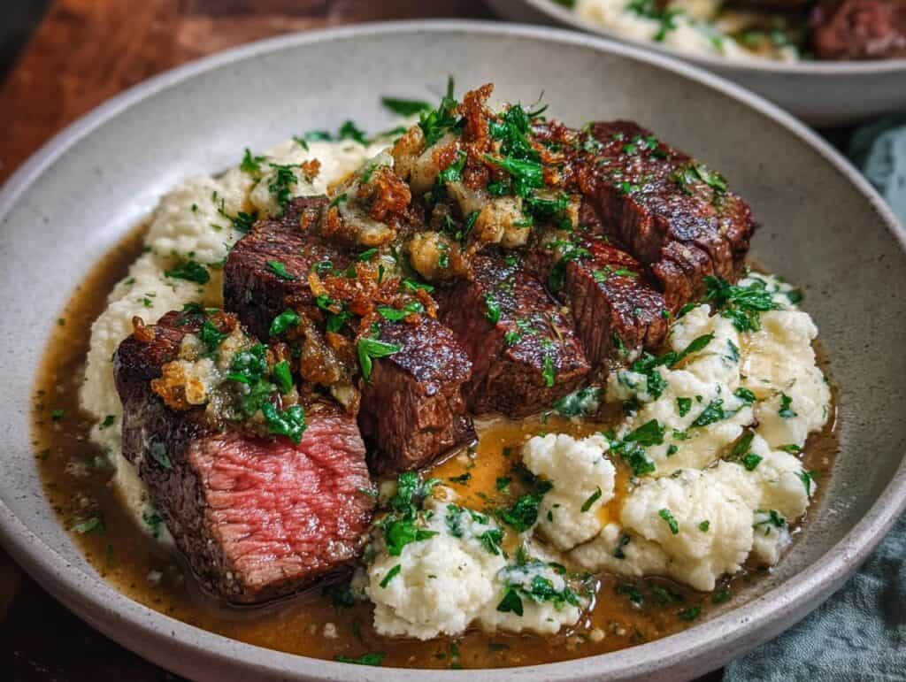 Enjoy this simple recipe for Brown Butter Steak with Roasted Garlic Whipped Cauliflower, featuring pan-seared ribeye steaks served over creamy, garlicky cauliflower, all drizzled with a savory brown butter parsley sauce.