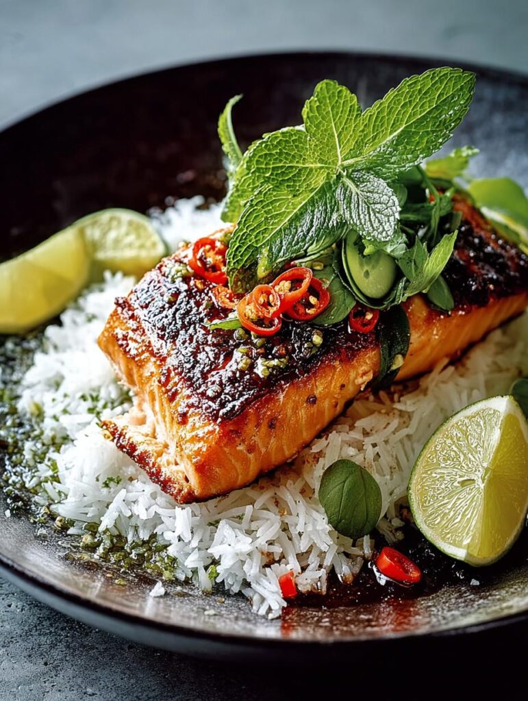 - Step 8: Spoon your creamy coconut rice into serving bowls, topping each with the caramelised salmon. Garnish with fresh coriander, mint, and Thai basil leaves, and serve with lime wedges.