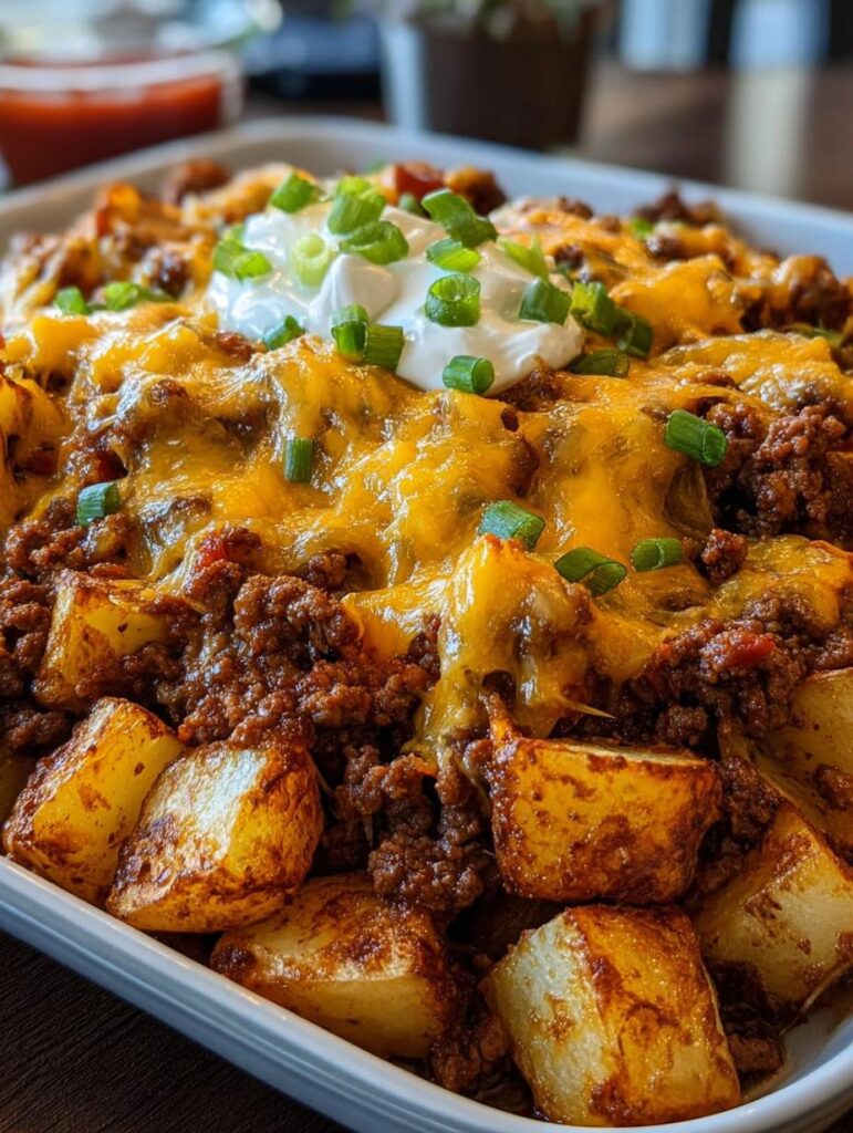 This crowd-pleasing dish combines crispy roasted potato cubes with savory taco-seasoned ground beef, all smothered in melted cheese. The potatoes are roasted until golden and crisp, then topped with perfectly seasoned beef and a generous layer of cheddar or Mexican blend cheese. After a quick trip back to the oven for that irresistible cheese melt, it’s ready for customization with toppings like sour cream, green onions, jalapeños, salsa, or guacamole. It’s a hearty, satisfying meal that brings together the best of taco flavors with comforting potatoes.