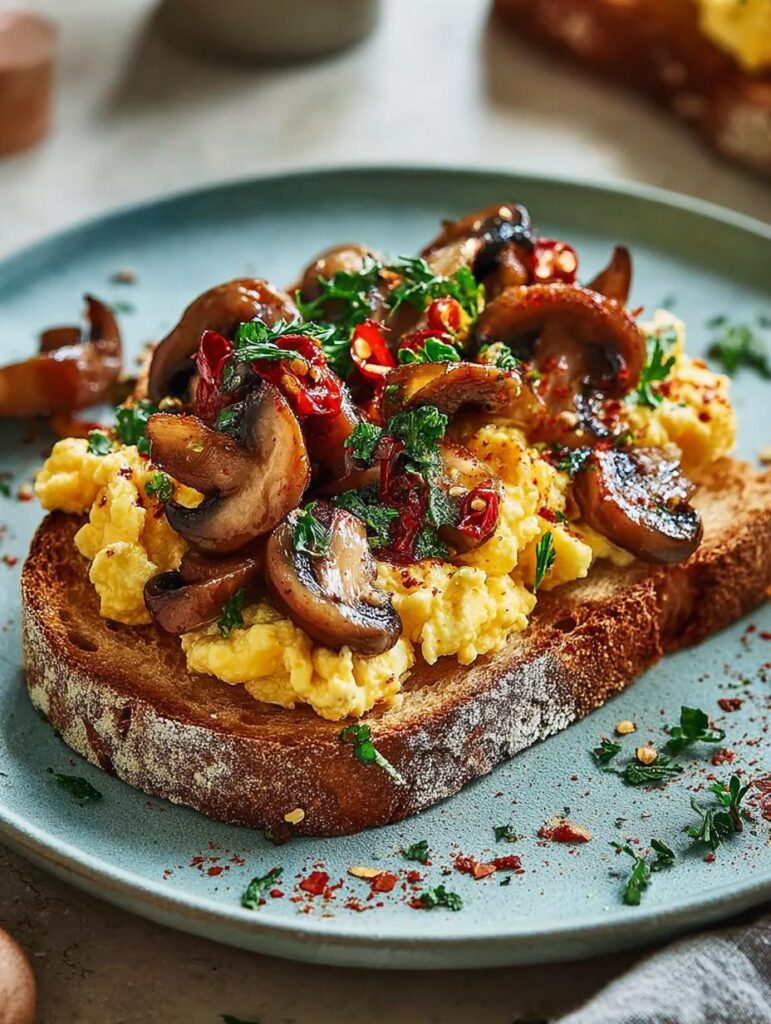 Chilli Oil Mushrooms with Creamy Scrambled Eggs on Sourdough offers a comforting dish that marries savory sautéed mushrooms, creamy scrambled eggs, and crispy sourdough.