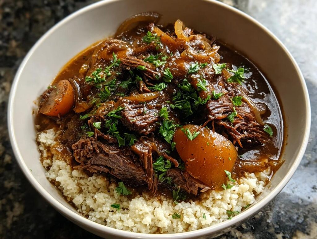 This Cider Braised Pot Roast recipe features tender beef chuck roast slow-cooked in a savory apple cider sauce with caramelized onions. Served over cauliflower rice, it’s a hearty and flavorful comfort food meal that’s also adaptable for various diets.