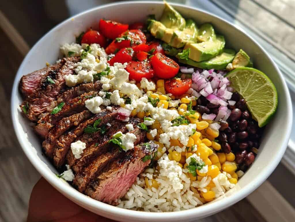 - In bowls, layer rice, black beans, corn, and sliced steak. Top with cherry tomatoes, avocado, red onion, and feta cheese (optional). Garnish with cilantro and serve with lime wedges.