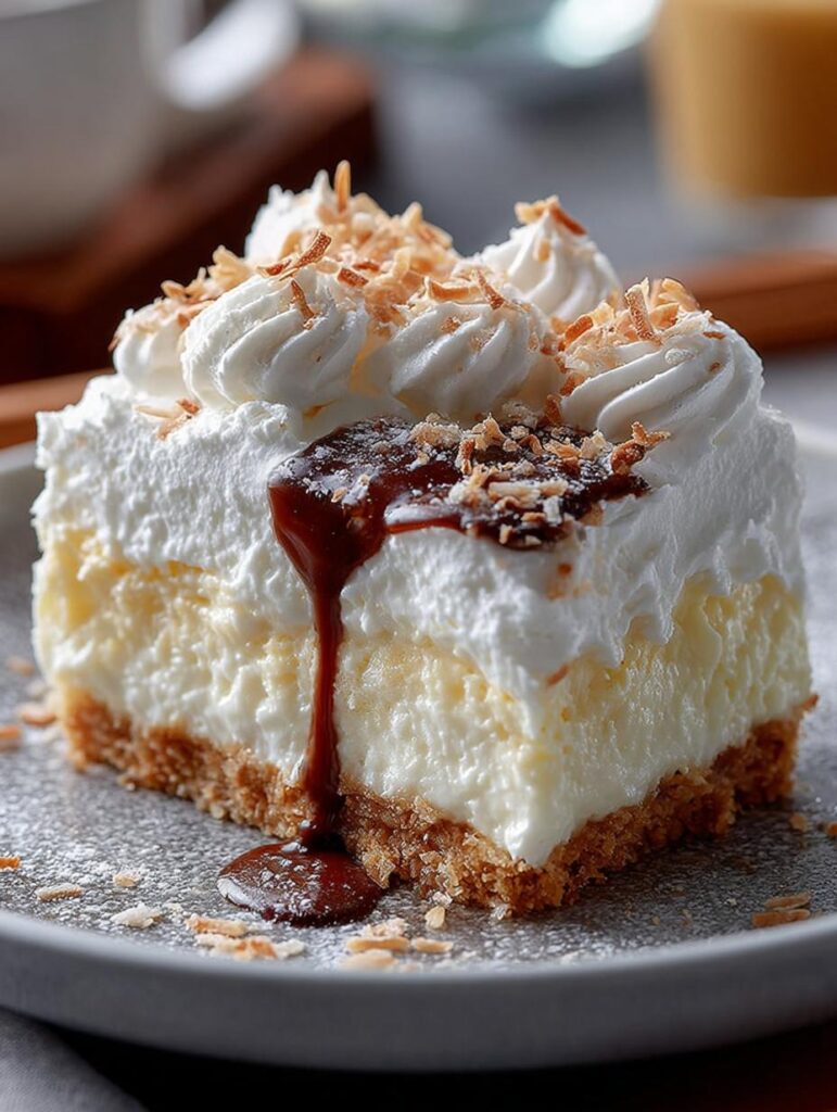 Indulgent layered dessert with graham cracker crust, cream cheese, coconut cream, and whipped topping for a tropical treat.