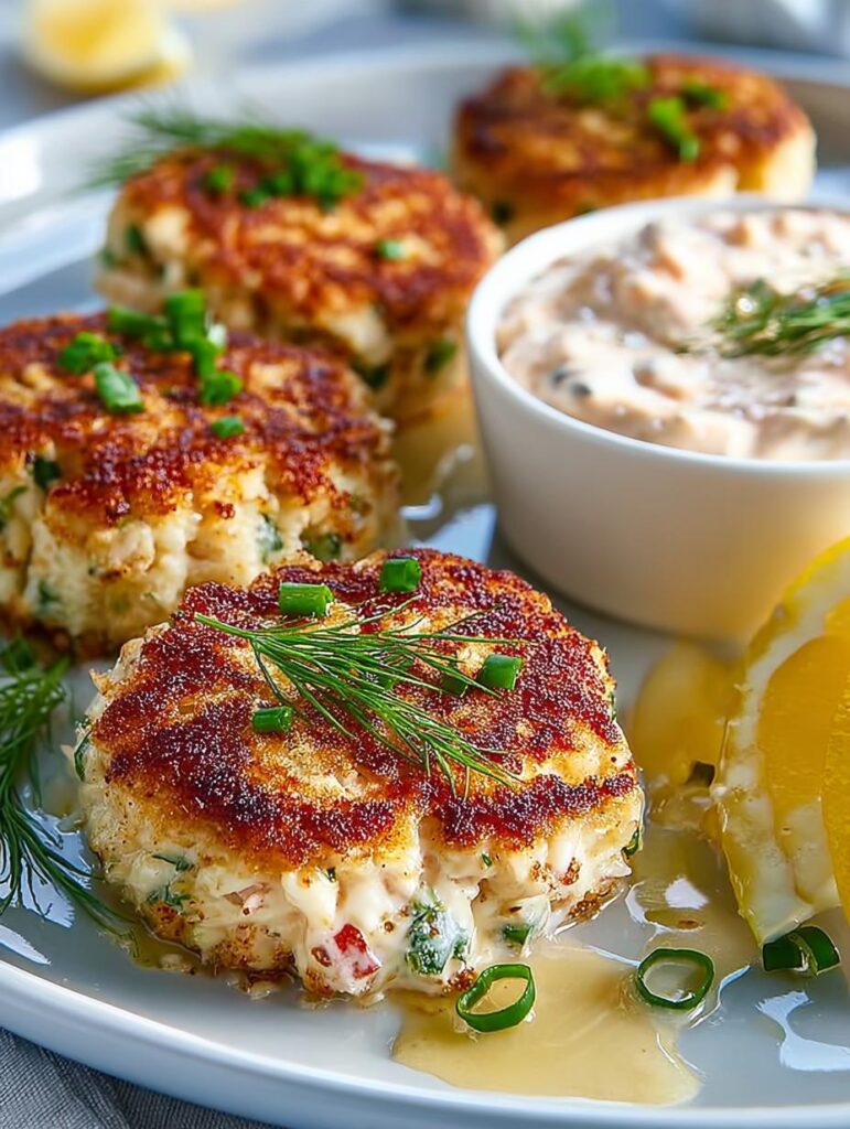 Delicious crab cakes paired with zesty remoulade sauce, perfect for appetizers or main courses.