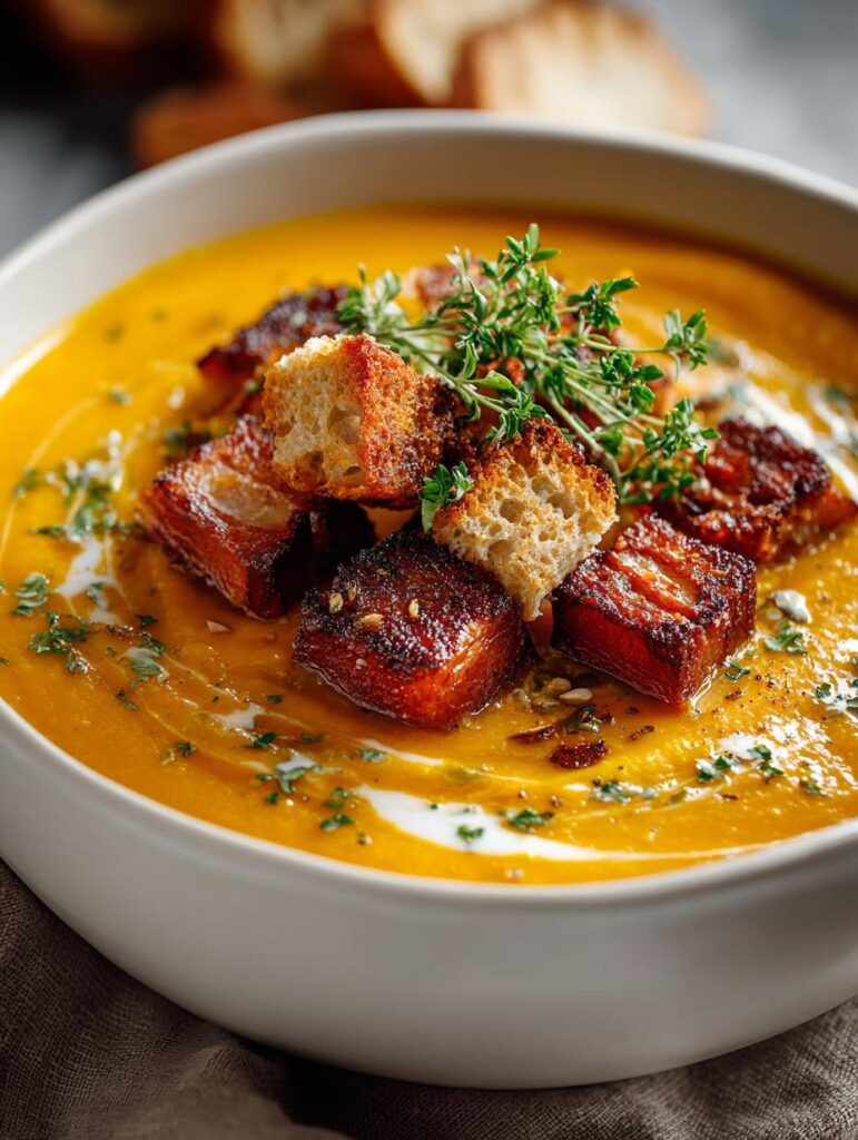 PrintCreamy Keto Pumpkin Soup with Crispy Pork Belly Delight
