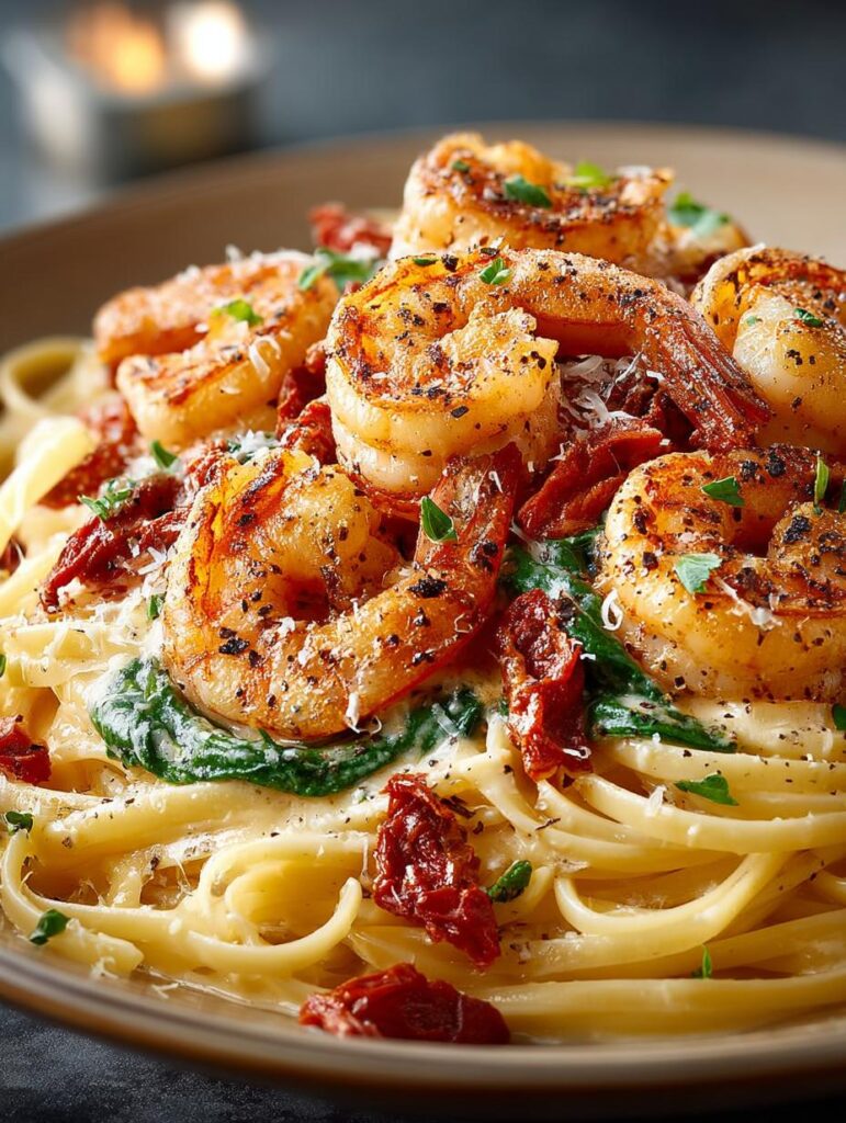 Creamy pasta with shrimp, sun dried tomatoes, and spinach.