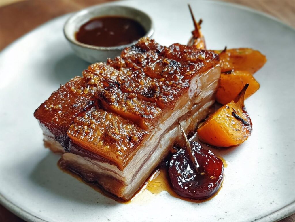 A recipe for crispy pork belly with a spiced plum sauce, perfect for dinner parties or family meals. This dish balances savory, crispy pork with a sweet and tangy plum sauce, complemented by roasted vegetables and a fresh salad.