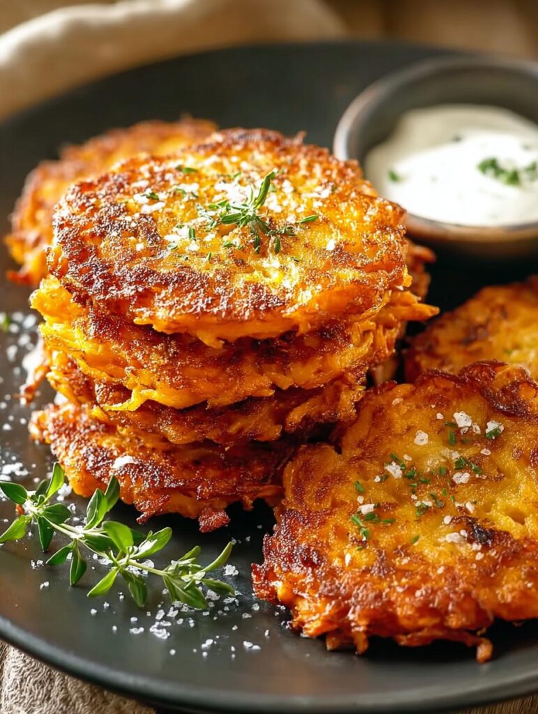 Delicious sweet potato latkes featuring a harmonious blend of sweetness and savory flavors, served with a creamy honey yogurt dip.