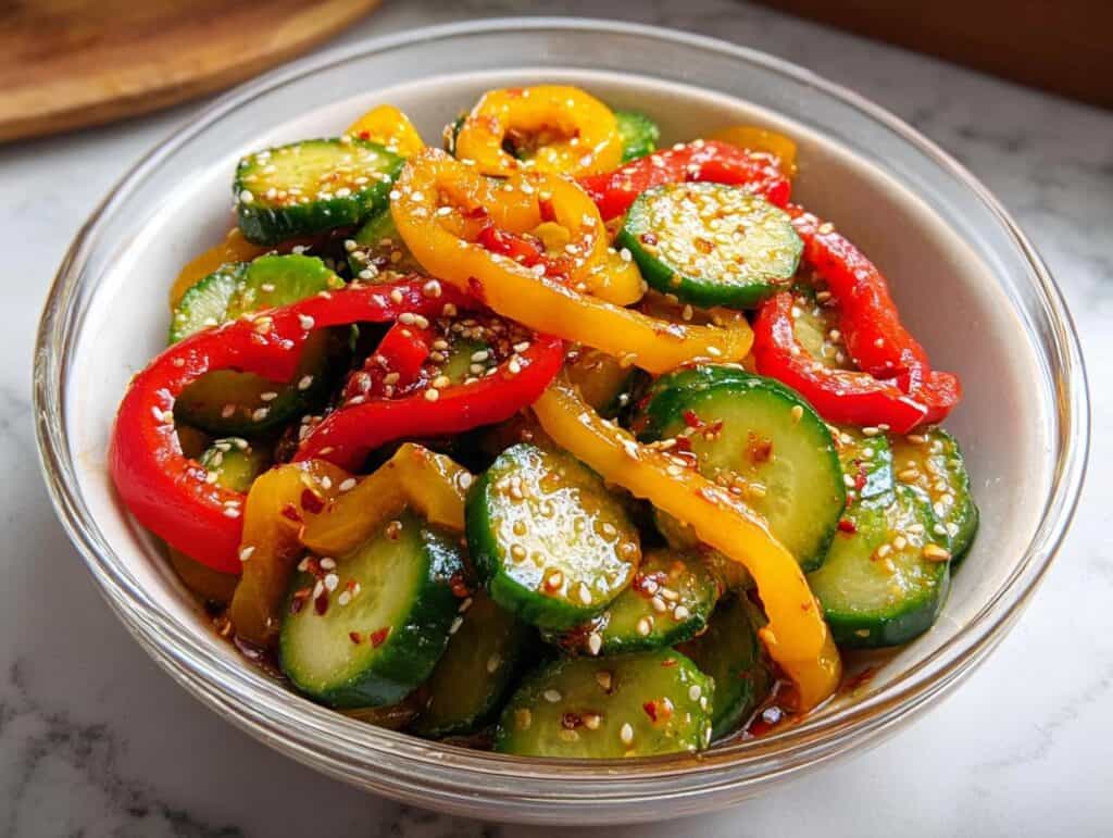 A cucumber sweet pepper salad is a refreshing mix of crisp cucumbers and colorful bell peppers, typically tossed in a light, zesty dressing. It’s a no-cook dish that celebrates fresh flavors and textures, making it perfect for a healthy lunch or side dish.