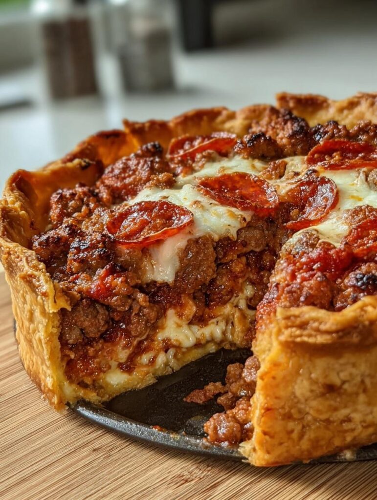 A hearty deep dish pie filled with ground beef, Italian sausage, and pepperoni, baked in a flaky crust with marinara sauce and gooey cheese. This meat lover’s pizza pie is a satisfying comfort food.