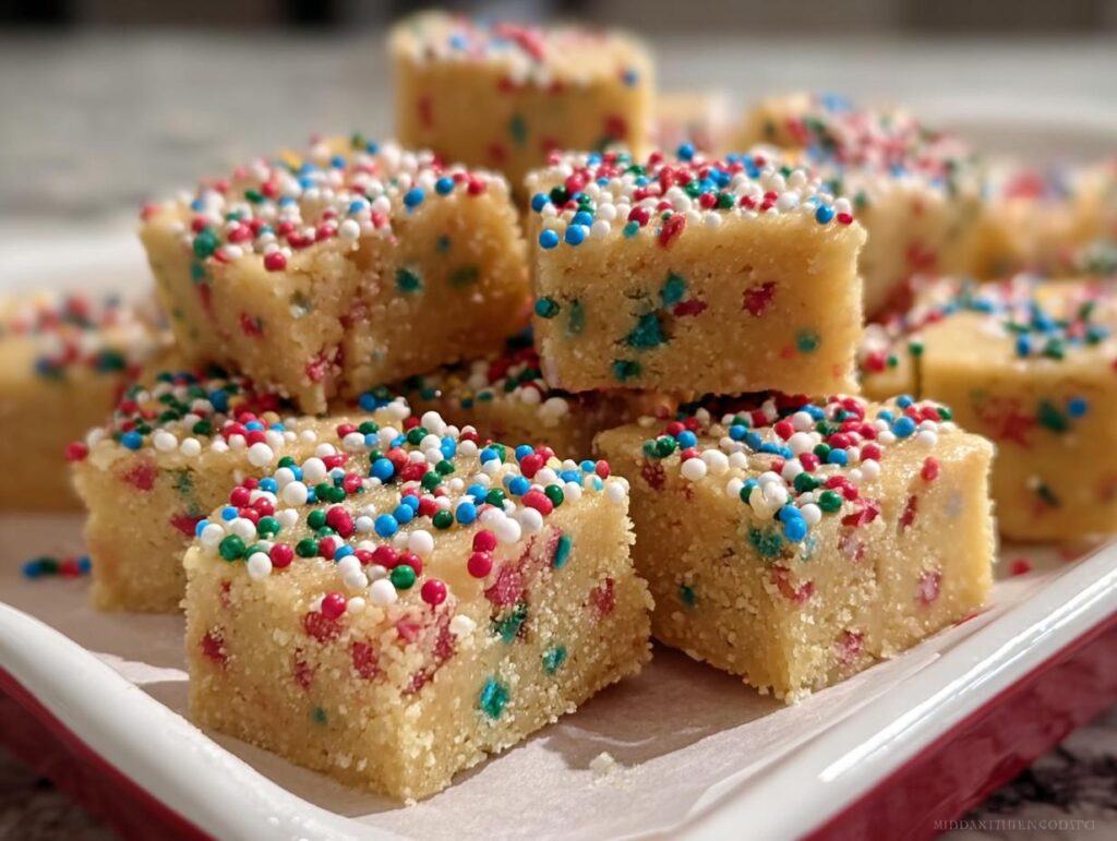 These delightful little squares are incredibly versatile and perfect for any holiday gathering. They truly shine as a beautiful almond butter dessert for holidays when presented on a festive platter alongside other seasonal treats. Imagine them nestled amongst gingerbread cookies and frosted sugar cookies – the colorful nonpareils add such a cheerful touch! For a more decadent experience, try serving them with a warm mug of spiced apple cider or a rich hot chocolate. They also pair wonderfully with a dollop of whipped cream or a small scoop of vanilla bean ice cream for a simple yet elegant dessert.