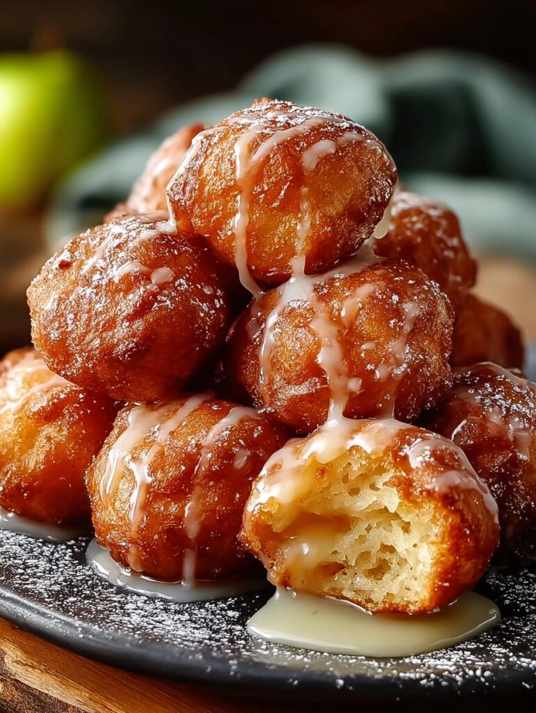 - While the fritters are still warm, dip or drizzle them with the glaze. Let the glaze set for a few minutes before serving.
