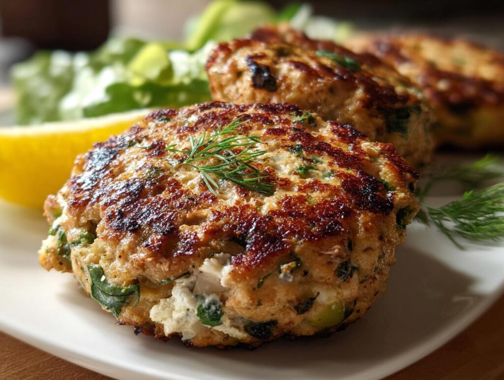 These Greek-inspired chicken burgers are a Mediterranean flavor explosion, combining ground chicken with sun-dried tomatoes, fresh dill, and oregano. They cook quickly on the stovetop or grill and are perfect served with tzatziki and feta for an authentic taste.
