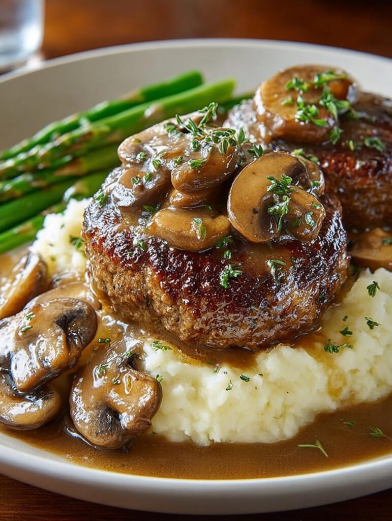 Juicy beef patties smothered in a rich mushroom gravy featuring caramelized onions, Worcestershire sauce and fresh herbs.