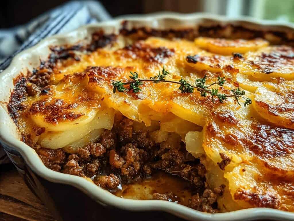 - In a greased casserole dish, layer half of the sliced potatoes. Spread half of the beef mixture over the potatoes, followed by a layer of cheese. Repeat with the remaining potatoes, beef mixture, and finish with cheese on top.
