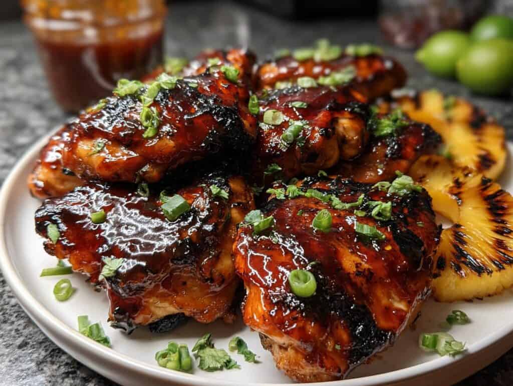 Keywords: Huli Huli Chicken, Hawaiian grilled chicken, pineapple soy glaze, grilled chicken thighs, easy chicken recipe, marinated chicken, sweet and savory chicken