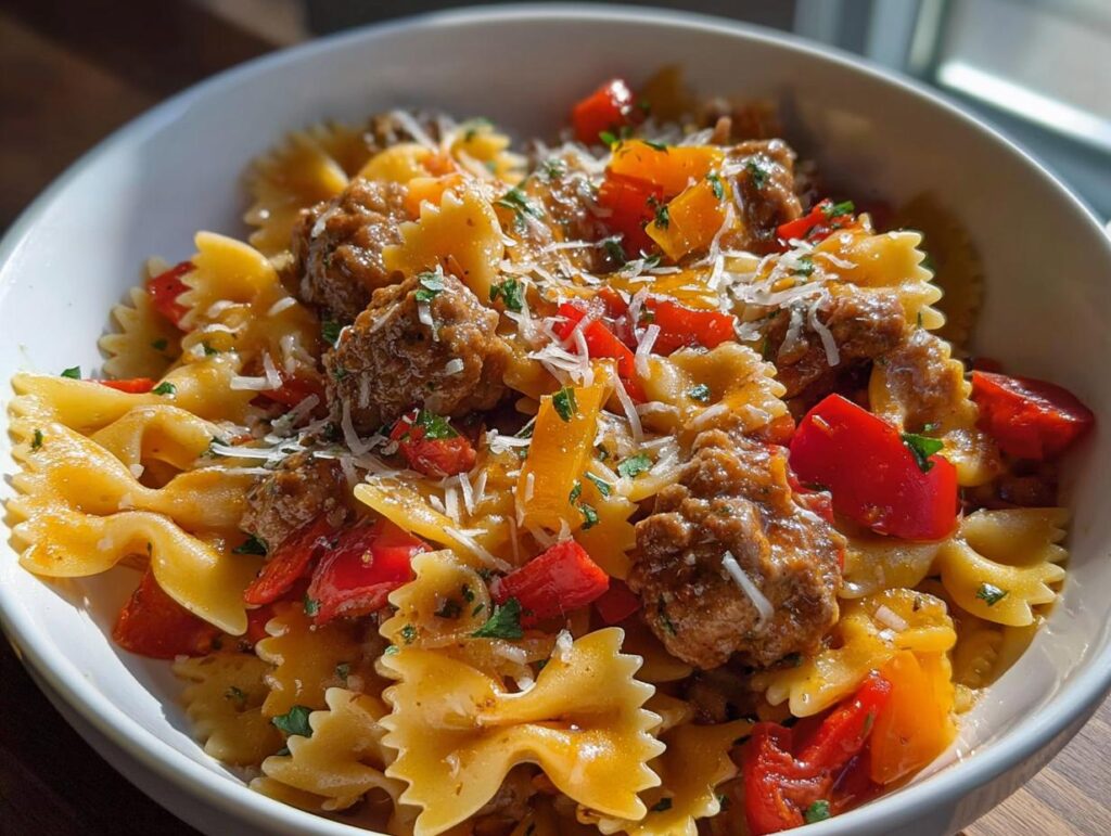 This easy Italian sausage bow tie pasta is a flavorful family dinner ready in under 30 minutes. It features savory Italian sausage, colorful bell peppers, and bow tie pasta coated in a light tomato sauce, finished with Parmesan cheese.