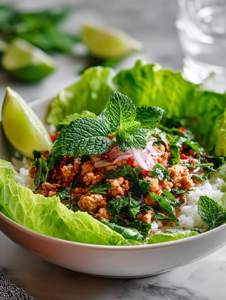 Keywords: Keto Ground Chicken Larb, Thai Minced Chicken Salad, Low Carb Salad