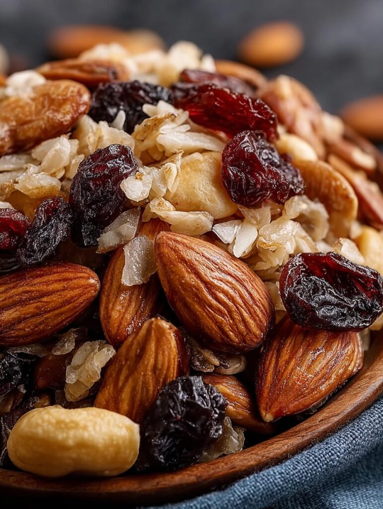 Enjoy this Keto Trail Mix packed with almonds, pecans, and coconut flakes for a satisfying crunch and health-conscious snack option.