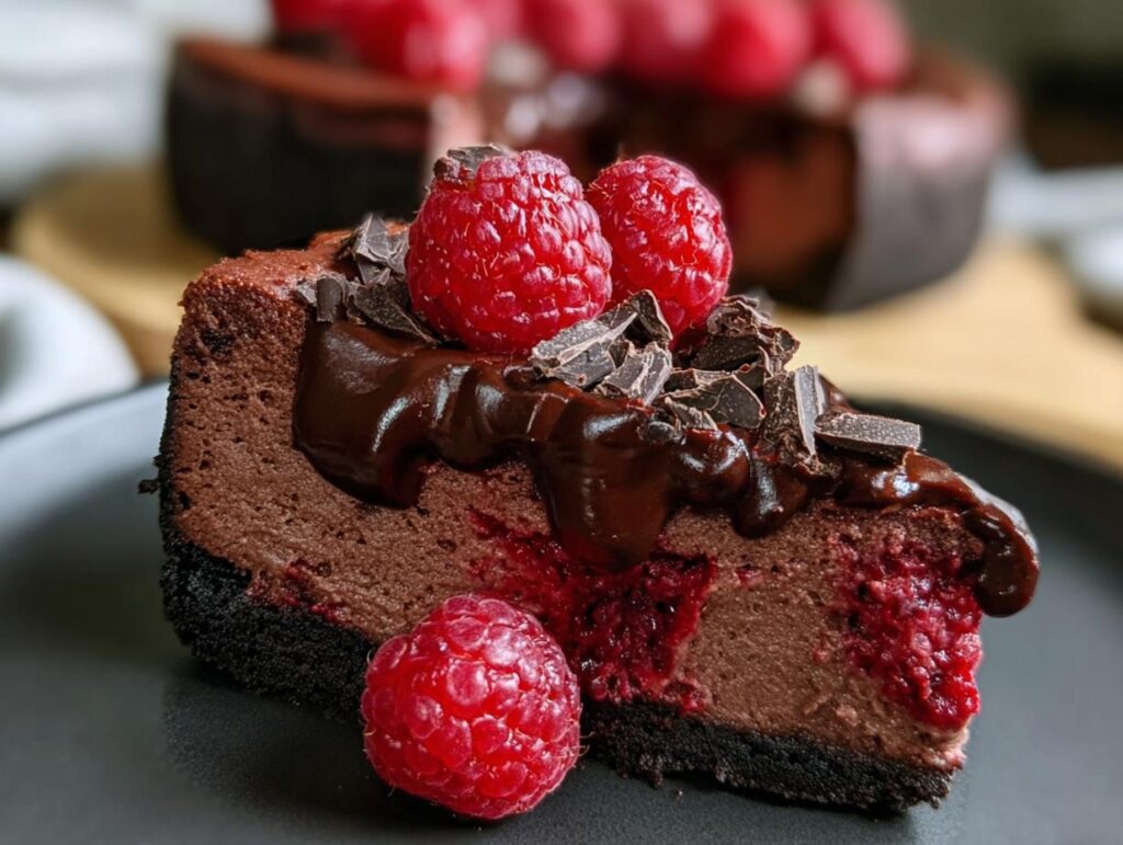 This Luscious Dark Chocolate Raspberry Cheesecake combines a rich, velvety dark chocolate cheesecake filling with a crisp chocolate cookie crust, topped with fresh raspberries and a glossy dark chocolate ganache. It’s an elegant and indulgent dessert perfect for any special occasion.