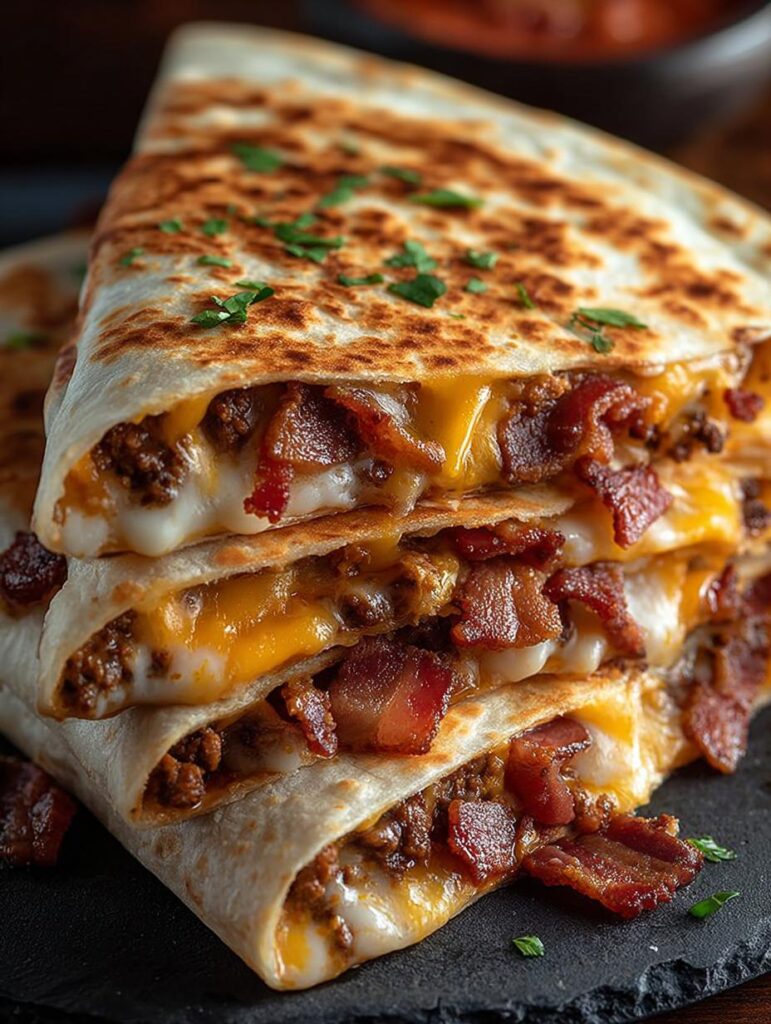 Crispy tortillas with maple-glazed beef, bacon and melted cheese – the perfect fusion of burger flavors in quesadilla form.