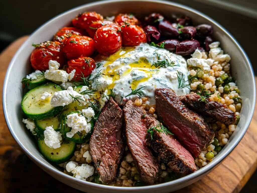 Keywords: Mediterranean Steak Bowl, Mediterranean steak salad, Steak bowl recipe Mediterranean, Healthy Mediterranean steak bowl, Easy Mediterranean steak bowl, Greek steak bowl recipe, Cilantro lime steak bowl Mediterranean, Mediterranean steak and grain bowl, Steak bowl with Mediterranean flavors, How to make a Mediterranean steak bowl, What is a Mediterranean steak bowl, Best Mediterranean steak bowl recipe, Mediterranean steak bowl with hummus, Lemon herb Mediterranean steak bowl, Mediterranean steak bowl with quinoa, Mediterranean steak bowl for lunch, Quick Mediterranean steak bowl, Mediterranean steak bowl ingredients, Steak bowl healthy Mediterranean style, Mediterranean beef steak bowl recipe, Mediterranean steak bowl with falafel