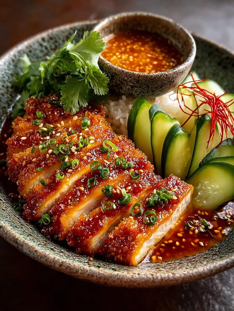 - Arrange the sliced katsu over the fluffy jasmine rice, ladle the prepared curry sauce on top, and garnish with pickled pears, toasted sesame seeds, fresh coriander, and thinly sliced spring onions.