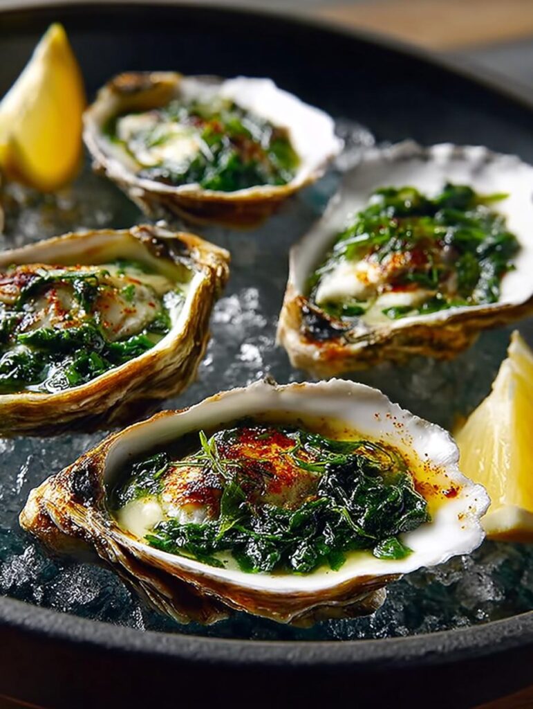 Indulge in luxurious Oysters Rockefeller, featuring fresh oysters, sautéed spinach, and creamy cheese for a perfect appetizer.