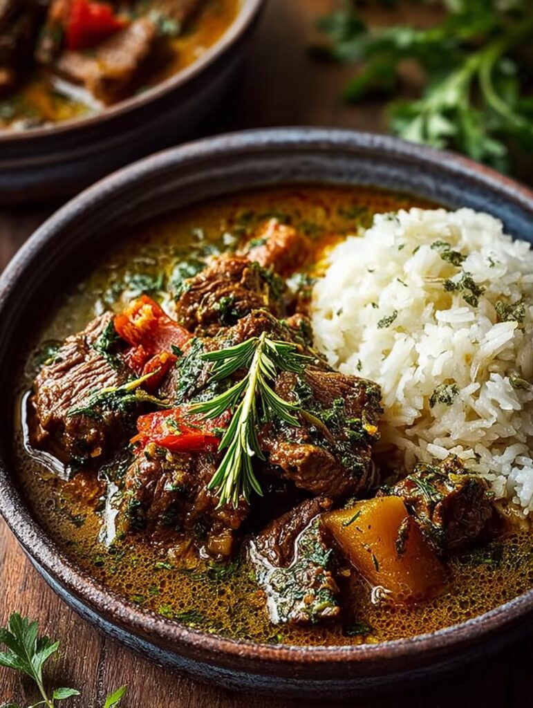 Persian Herb and Beef Stew with Rice: A flavorful dish featuring tender beef, fresh herbs, and spices.