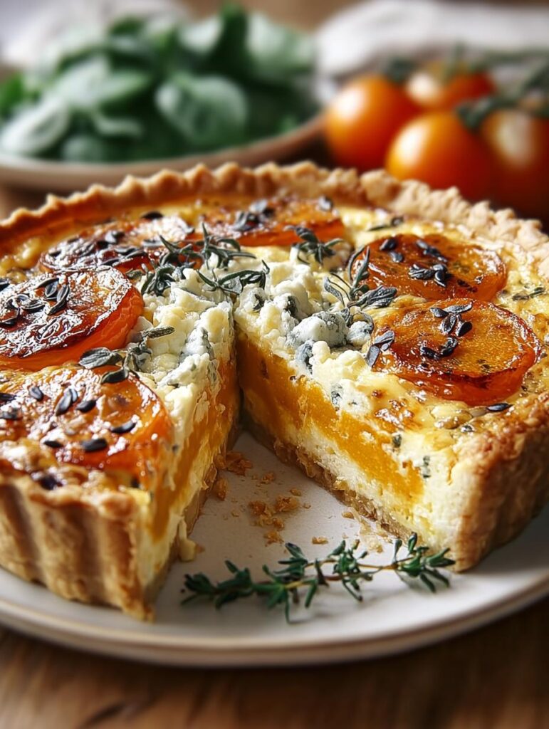 Deliciously creamy Pumpkin & Gorgonzola quiche, perfect for any occasion.