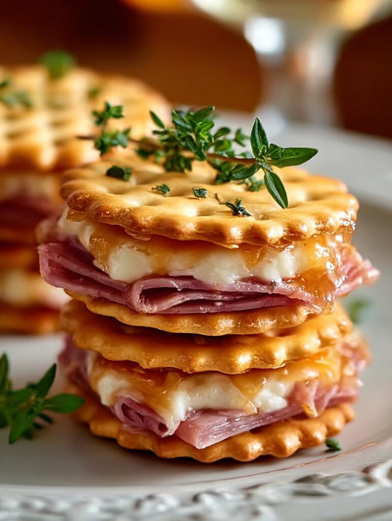 - Layer a small square of deli ham and a slice of cheese on top of each cracker.