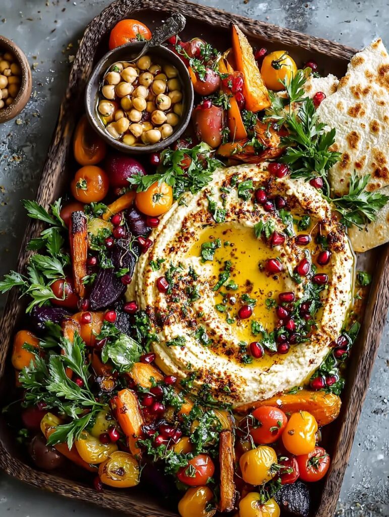 - Assemble platter by spreading hummus over a serving board. Top with roasted vegetables, followed by chickpeas. Garnish with pomegranate seeds, toasted pine nuts, and fresh herbs. Drizzle with balsamic glaze before serving.