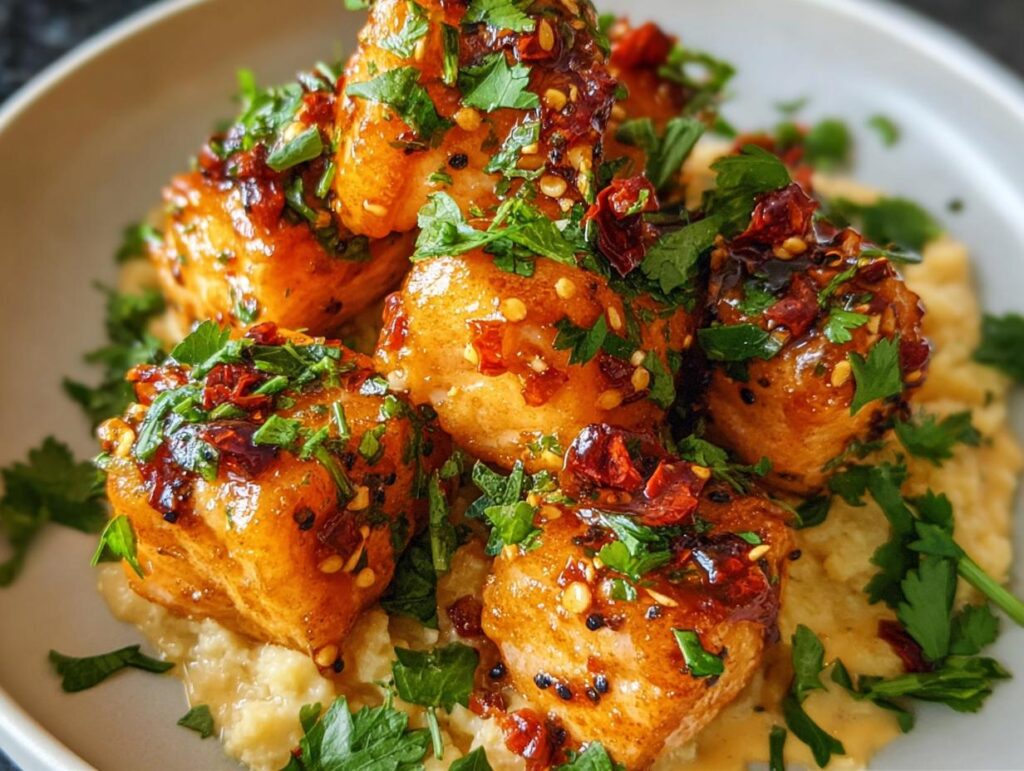 - Step 9: Garnish with fresh 2 tablespoons Chopped Cilantro or Parsley and a few extra chili crisps if you like. This is how to make spicy chili salmon bites that look as good as they taste.