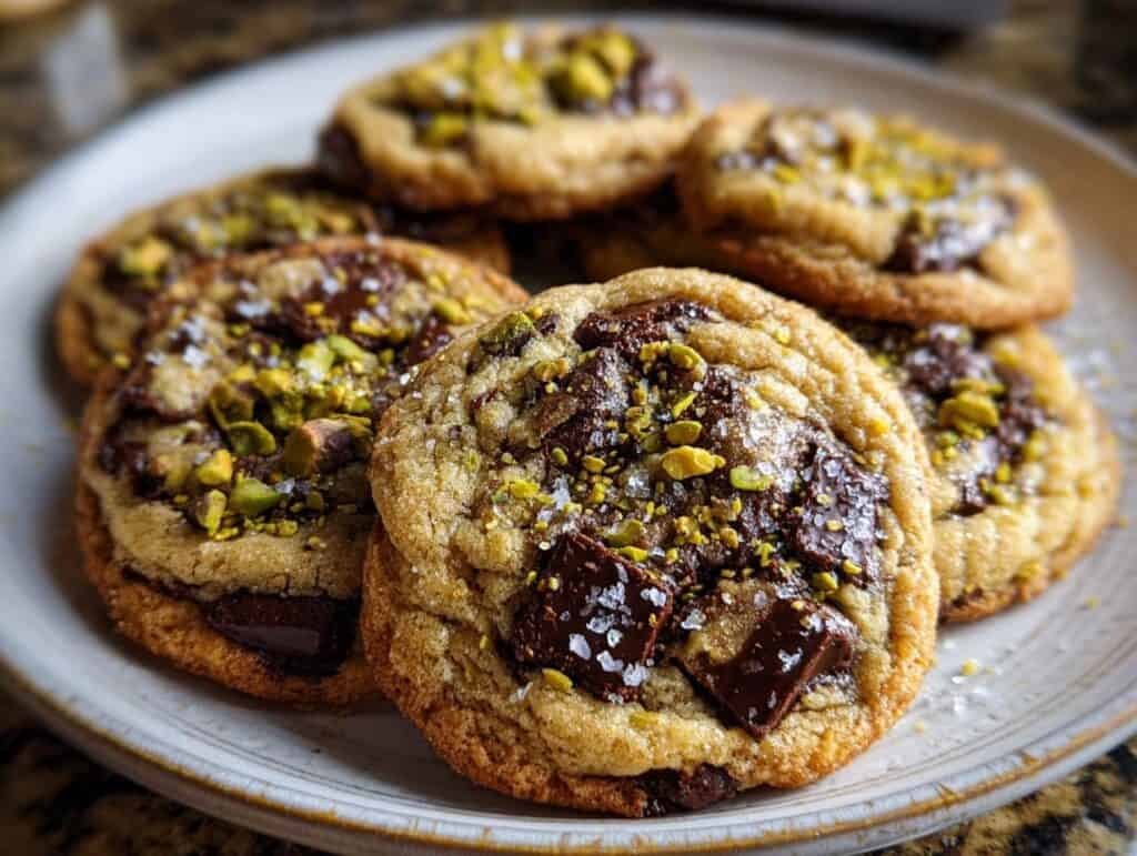 Enjoy these Salted Pistachio Chocolate Chunk Cookies, a delightful treat that perfectly balances sweet, salty, and nutty flavors with rich chocolate and crunchy pistachios in a soft, golden cookie.