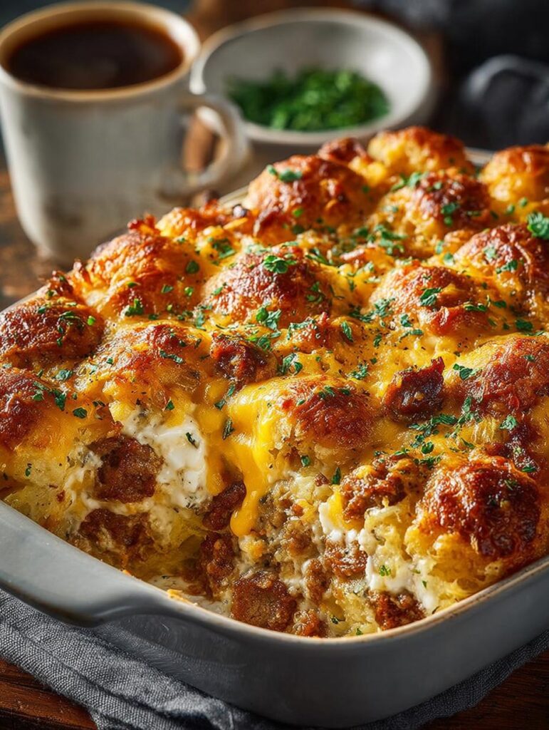 Wholesome bake with sausage, cheese, and biscuit layers, complemented by bold seasonings.
