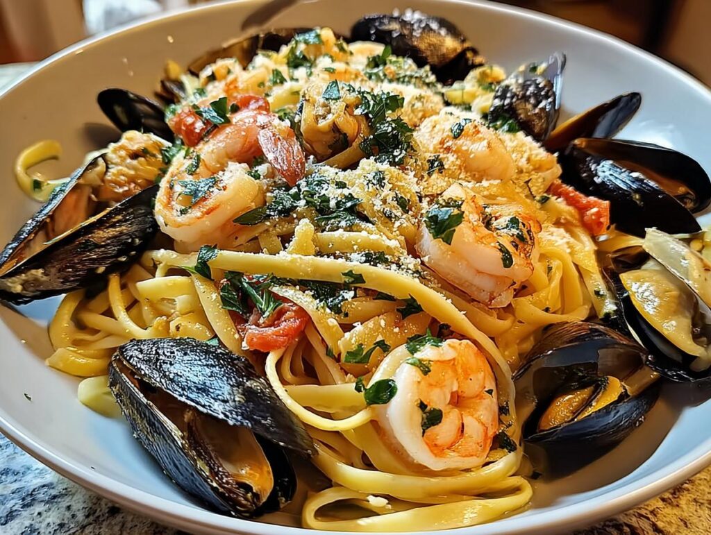 A delicious and elegant Seafood Pasta with Linguine, Shrimp, and Mussels recipe. This dish combines succulent shrimp, tender mussels, and perfectly cooked linguine with a flavorful garlic and white wine sauce. It’s quick to prepare, making it ideal for weeknight dinners or special occasions.