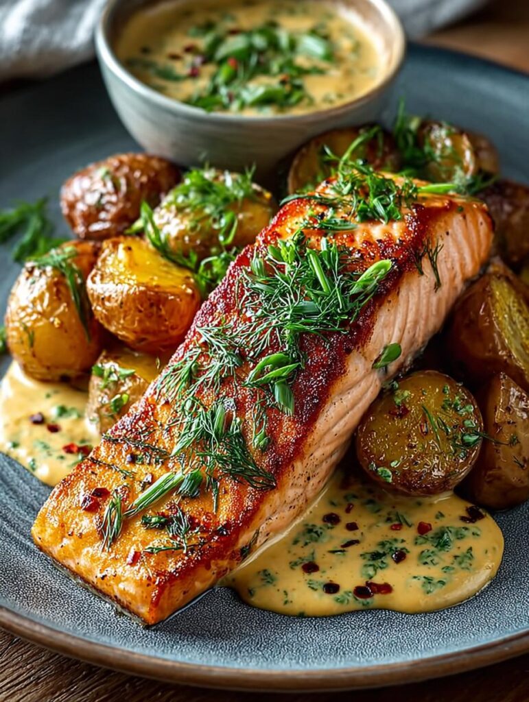 Seared Salmon with Roasted Potatoes & Paprika Aioli is a delightful dish that combines perfectly cooked salmon with crispy roasted potatoes and a flavorful aioli.