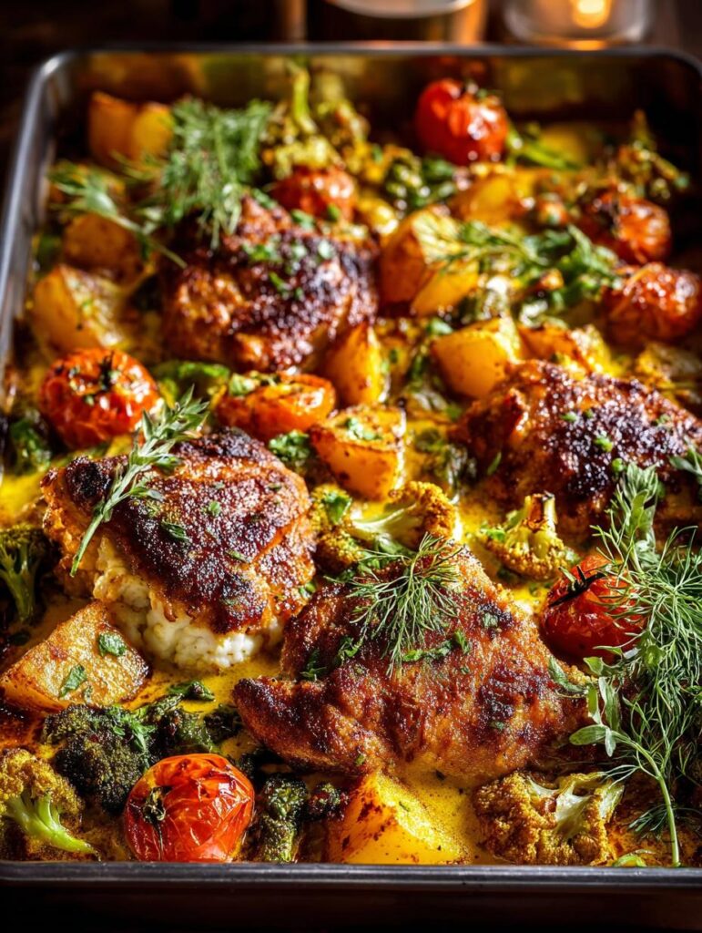 Savory Sheet Pan Curry Butter Chicken with Sweet Potatoes.