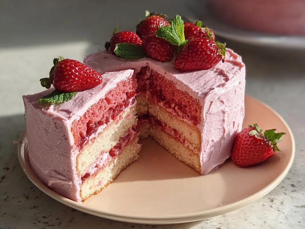 This delightful cake is a celebration in itself, but here are a few ways to make it even more special. Serve a slice of this lovely cake as is, perhaps with a small dollop of dairy-free whipped cream or a scoop of vegan vanilla ice cream. For an extra layer of fruity flavor, you can’t go wrong with a side of homemade plant-based strawberry preserves recipe. It’s also wonderful with a light dusting of powdered sugar and a few fresh mint leaves for garnish. This cake pairs beautifully with a cup of herbal tea or a refreshing glass of sparkling water.