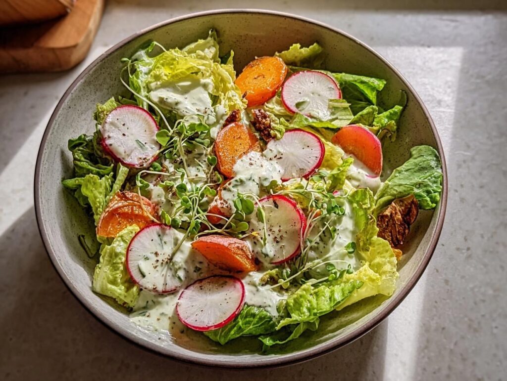 A refreshing and vibrant Summer Salad featuring crisp seasonal vegetables and a creamy, homemade clean eating buttermilk dressing. This salad is perfect for a light lunch or dinner, emphasizing fresh flavors and healthy ingredients.
