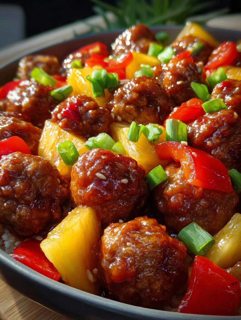 - Step 6: For a final burst of freshness and color, gently toss in the 4 spring onions, cut into 3 cm batons (white and green parts). Give it one last gentle stir. Serve these amazing sweet sour meatballs with pineapple immediately over fluffy steamed rice. Enjoy every delicious bite!